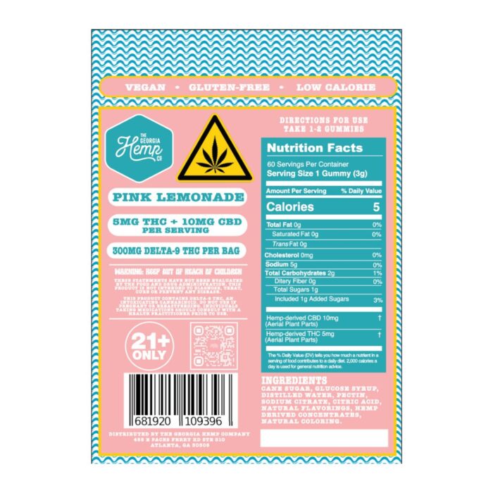 THC Gummies • 5mg THC+10mg CBD • Pink Lemonade • 60ct